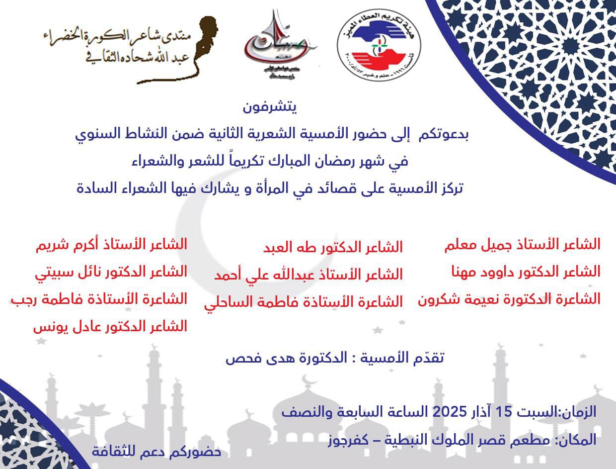 نظّمت هيئة تكريم العطاء المميز الأمسية الشعرية الثانية بعنوان “قصائد في المرأة”، وذلك بمشاركة منتدى شواطئ الأدب – بشامون ومنتدى شاعر الكورة الخضراء عبدالله شحادة الثقافي، والتي أقيمت في قصر الملوك – كفر جوز، النبطية، سادت أجواء مميزة احتفاءً بالمرأة والأم.