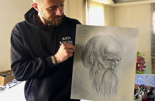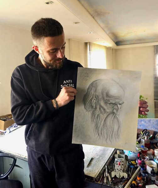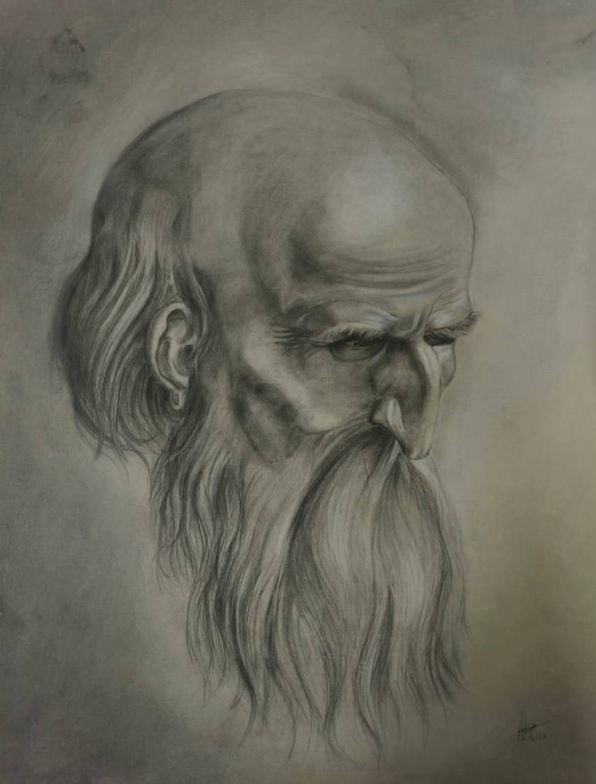 هذه الرسمة هي دراسة شخصية قمت بها باستخدام الغرافيت، كتفسير بصري للعمل الأصلي رأس أحد الرسل للفنان ألبريشت دورر، أحد أعلام عصر النهضة في شمال أوروبا. استخدمت أقلام HB، B1، وB2، وسعيت من خلالها إلى تطبيق أسلوب الكياروسكورو (chiaroscuro) لإبراز الحجوم عبر التلاعب الدقيق بالضوء والظل. كما أضفت لمسات من الباستيل الأبيض في مناطق محددة من اللحية وأجزاء من الوجه، بهدف خلق بعد بصري وهدوء ضوئي يضيء ملامح الشخصية.